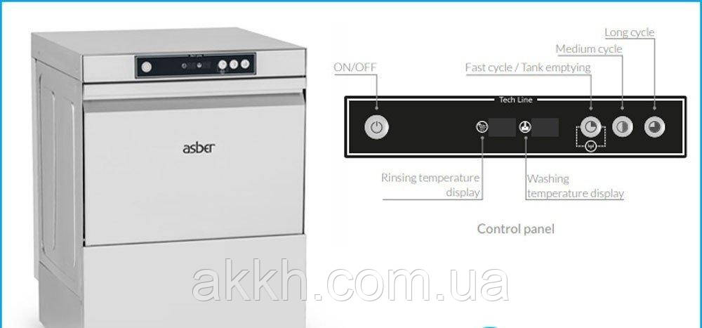 Вибираючи професійні посудомийні машини Asber для закладів громадського харчування з високою прохідністю, зверніть увагу на цю модель. Вона має параметри, подібні до попередньої. Відмінність полягає у наявності електронної панелі управління.